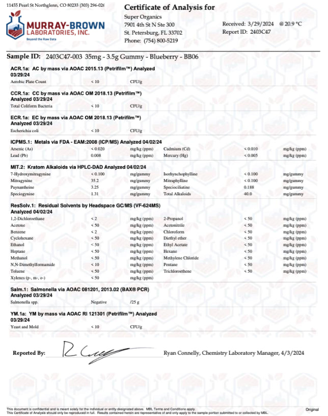 - 35mg of mitragynine per gummy – equivalent to 2.33 grams of kratom powder at a 1.5% mitragynine level.